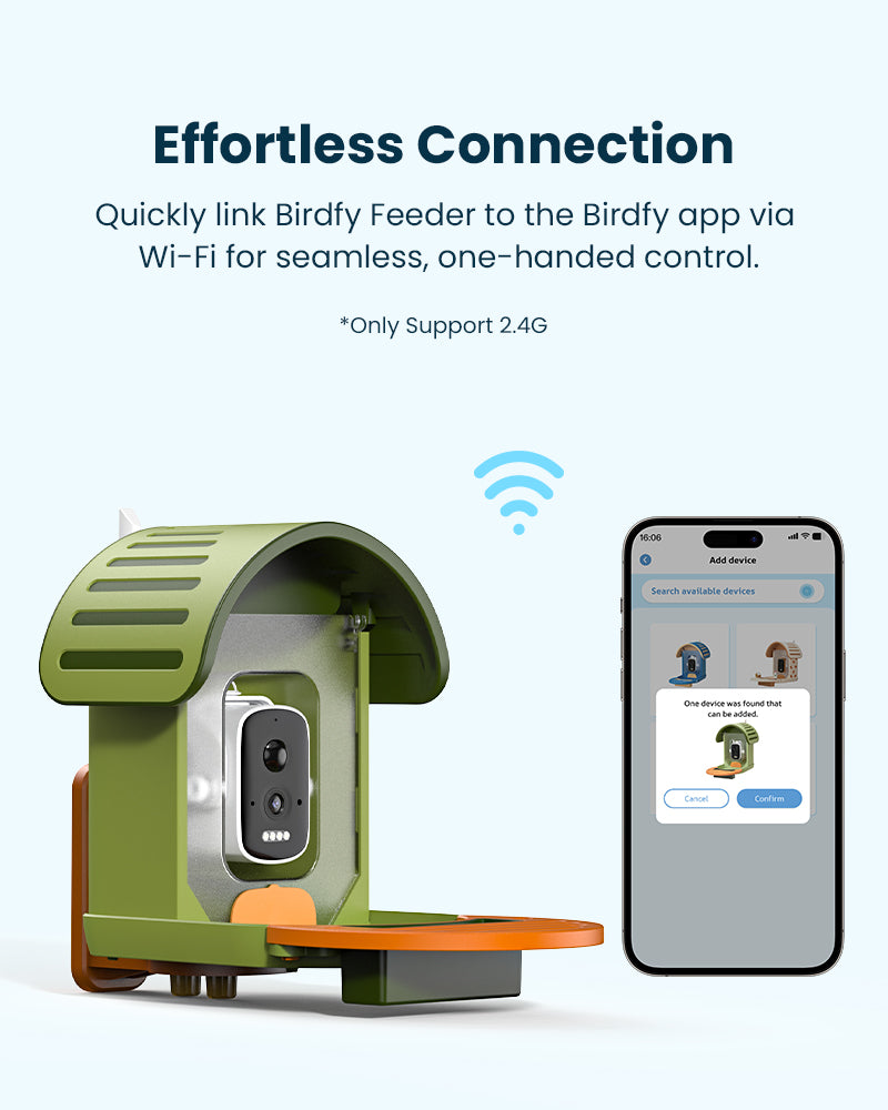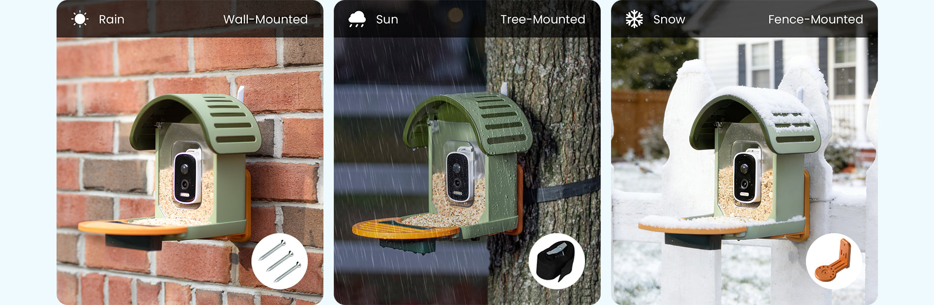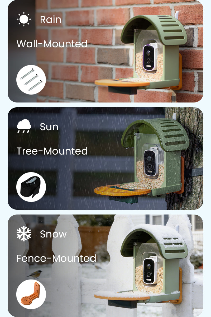 • Durable Outdoor Design: Solar-powered, waterproof, and WiFi-connected for effortless bird watching with a 1.5L seed capacity.