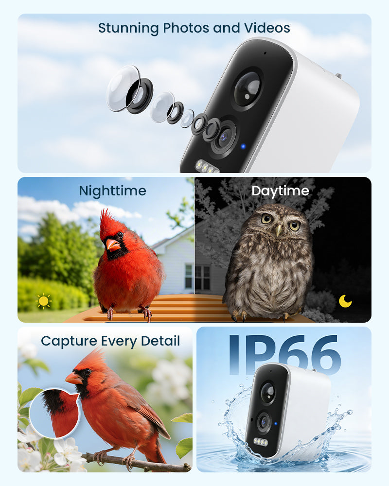 Experience crystal-clear 2.5K resolution.Every bird movement and color detail will be brought right before your eyes no matter day or night.