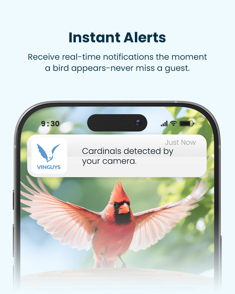 • AI Bird Identification: Identify 11,000+ bird species with real-time alerts using Vinguys' advanced AI technology.